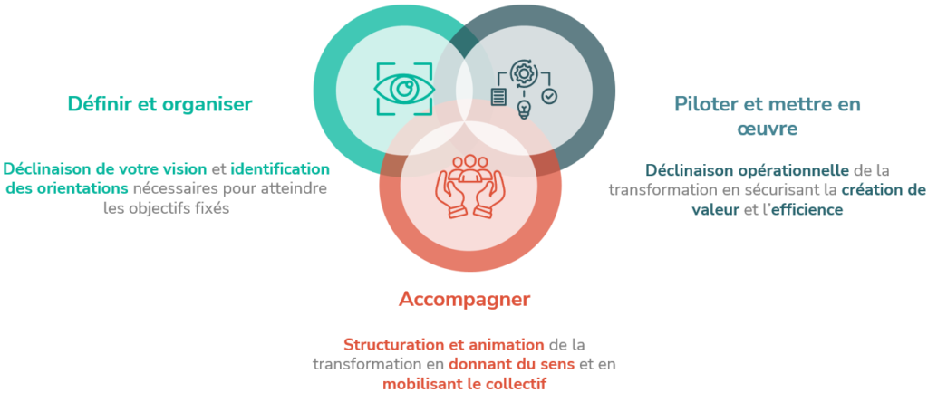 Nos savoir-faire s’articulent autour de nos 3 dimensions d’intervention, mises en œuvre de façon ciblée ou complémentaire. Elles nous permettent d’adresser l’ensemble de vos enjeux de transformations.